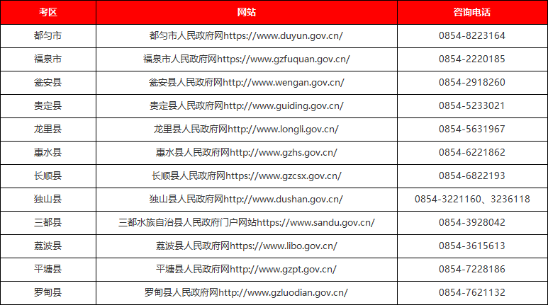 黔南州其它考区成绩公布有关事宜请考生自行登录各县(市)人民政府官网查看,具体网址及咨询电话如下: