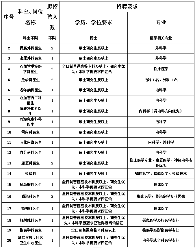 医疗相关专业博士研究生学历,待遇优厚,薪酬面议。待遇组成包括但不限于薪酬、安家费、 住房(购房补贴)、科研平台启动资金。