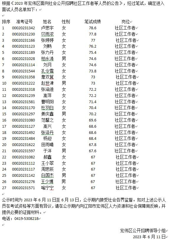 2023年宏伟区公开招聘社区工作者进入面试人员名单