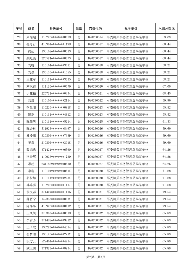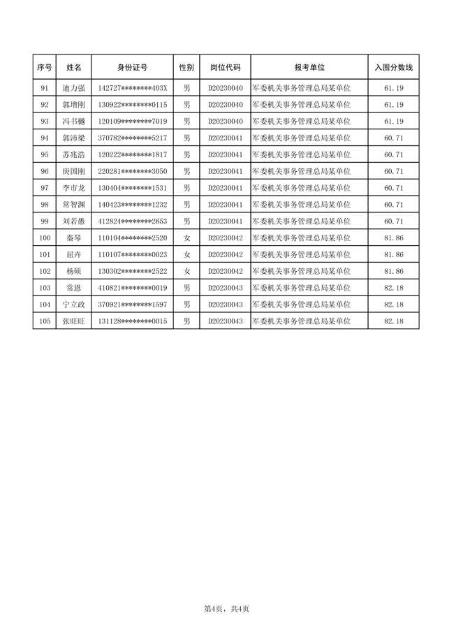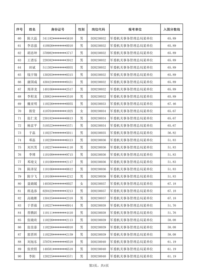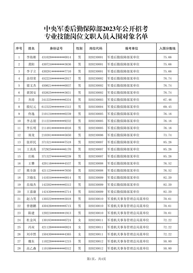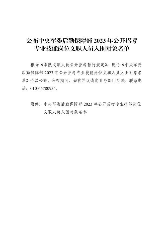 公布中央军委后勤保障部2023年公开招考 专业技能岗位文职人员入围对象名单