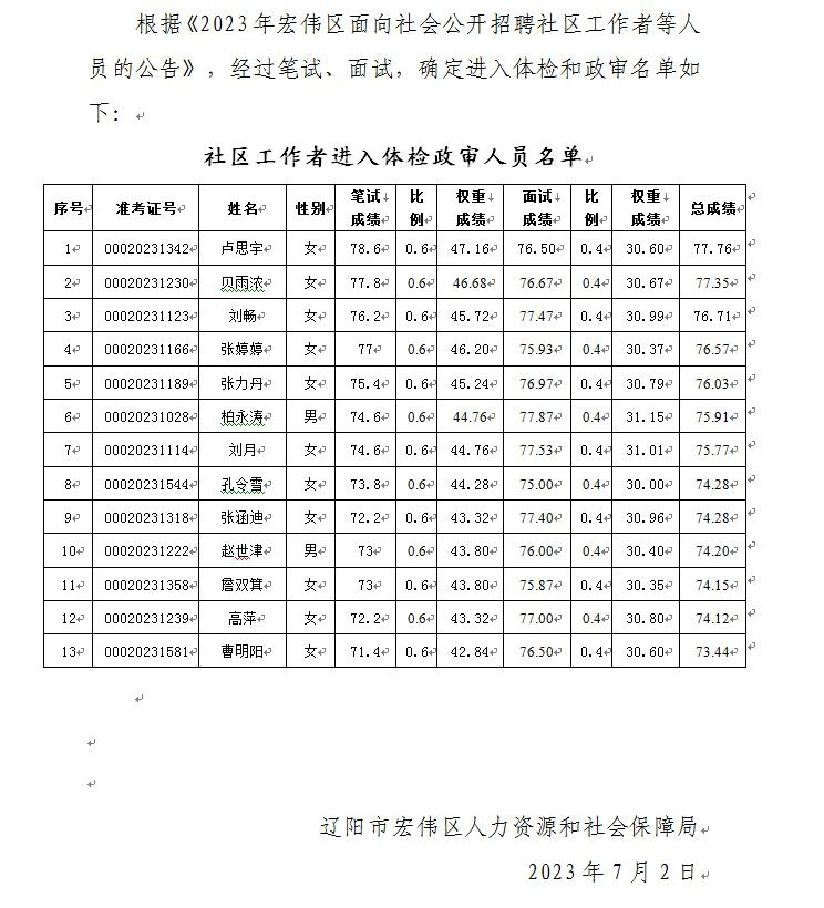 2023年宏伟区面向社会公开招聘社区工作者进入体检政审名单