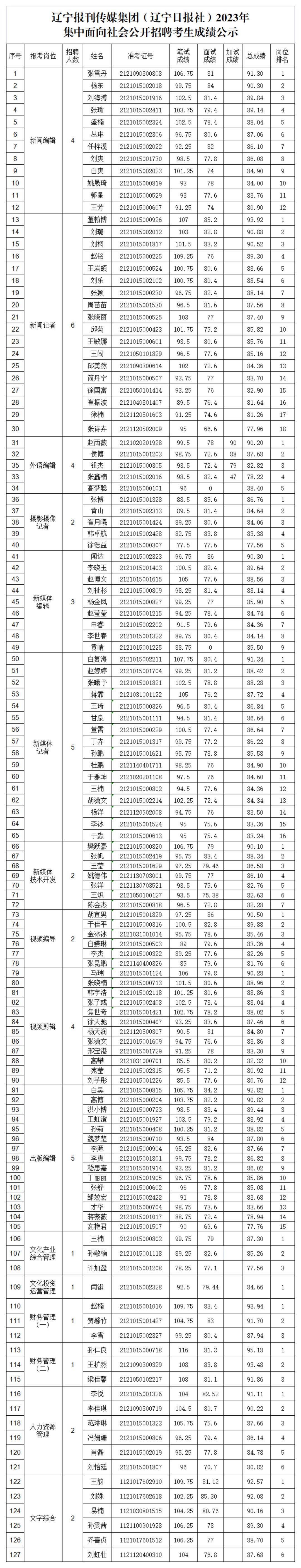 辽宁报刊传媒集团(辽宁日报社)2023年集中面向社会公开招聘考生成绩公示