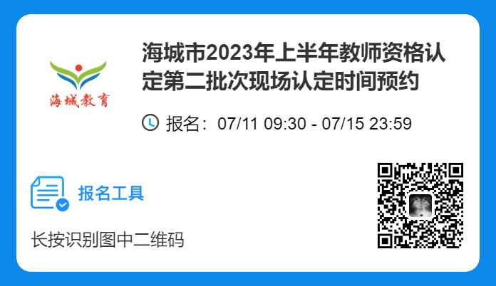 海城市教育局定于2023年7月17日—19日期间开展2023年上半年第二批次幼儿园、小学、初级中学教师资格认定现场确认工作,请认真阅读《公告》,并按要求进行网上预约(见附件1),预约成功后按预约时间携带相关材料到指定地点进行现场确认。