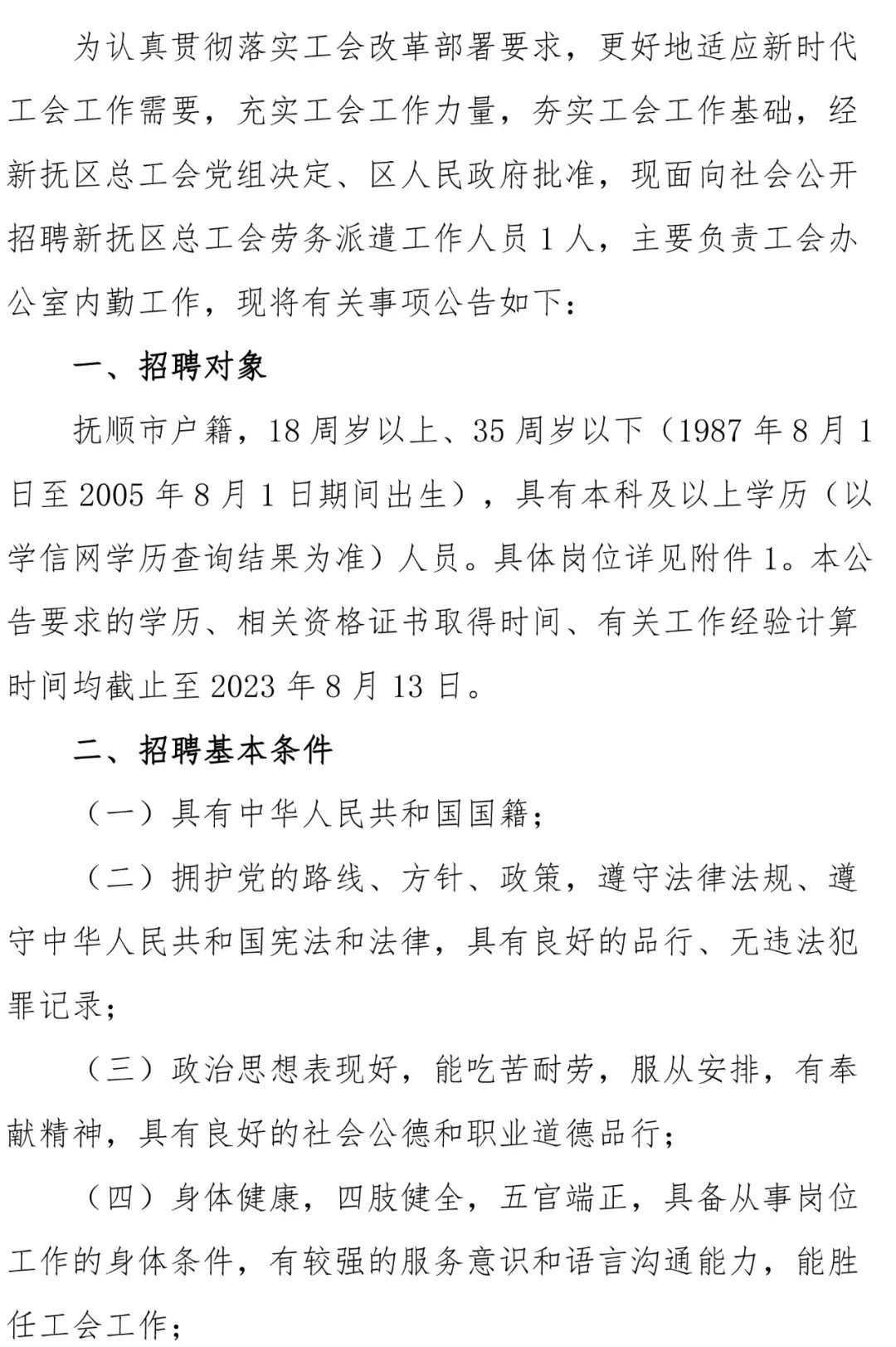 2023年抚顺市新抚区总工会公开招聘劳务派遣工作人员1人公告