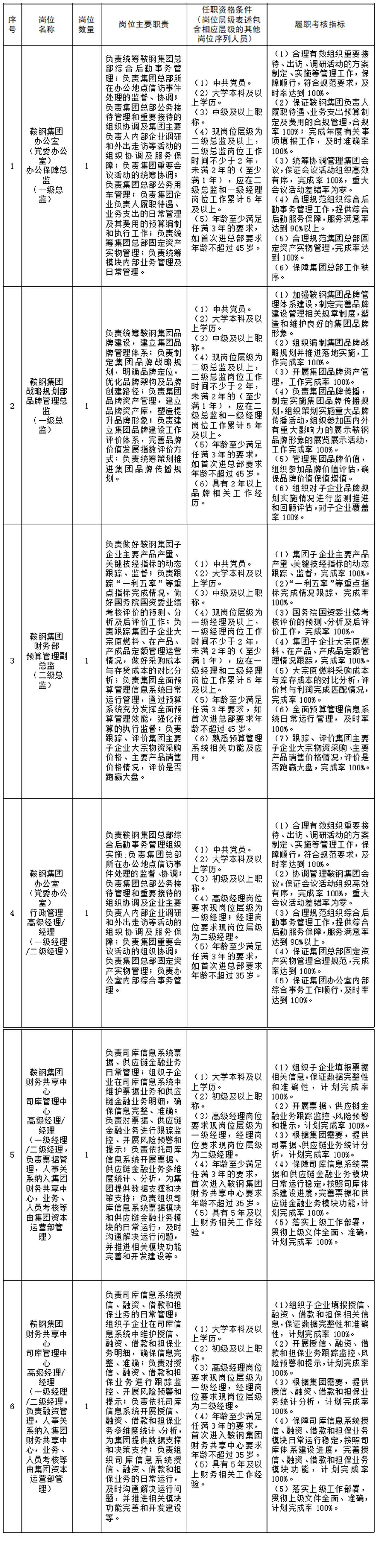 按照鞍钢集团三项制度改革相关要求,为进一步扩大选人用人视野,鞍钢集团党委组织部决定在全集团范围内公开选拔6名集团专业职能岗位人员,欢迎符合条件的人员和广大职工积极参与和监督。具体要求如下: