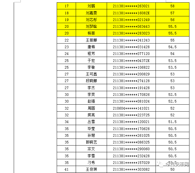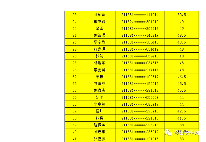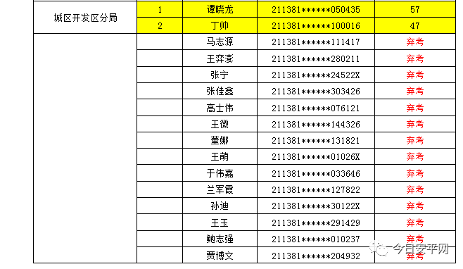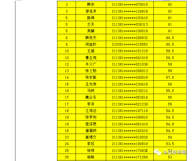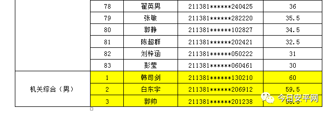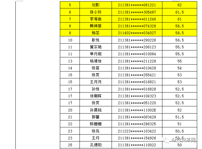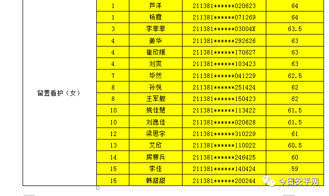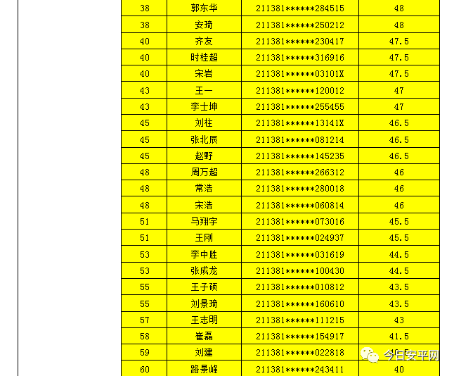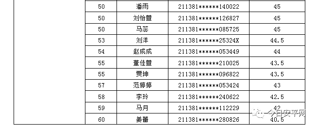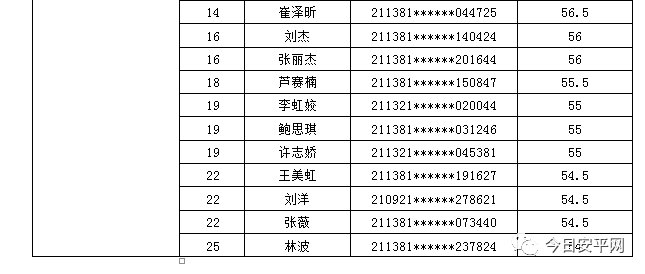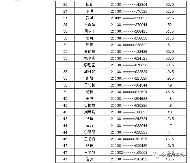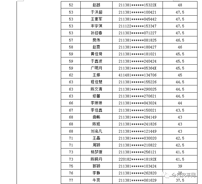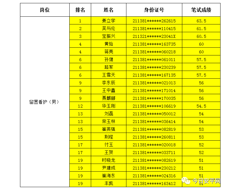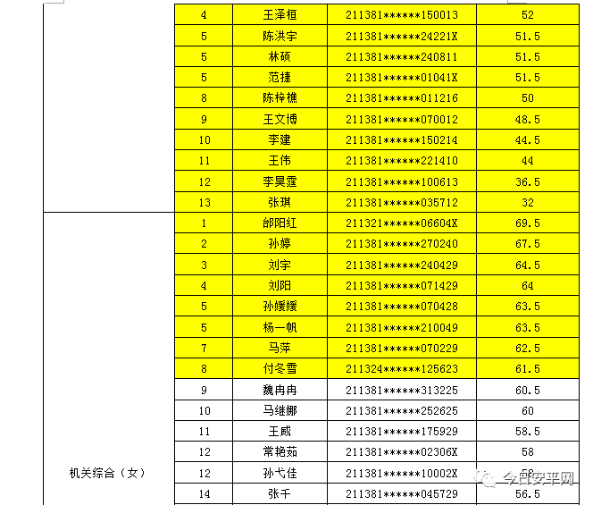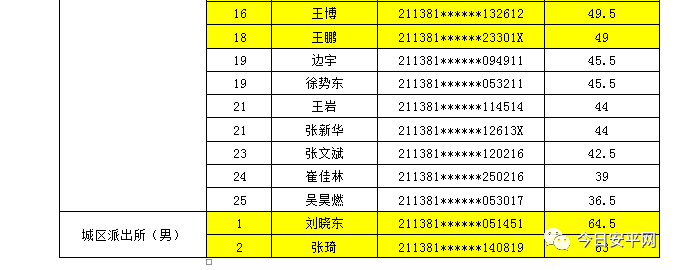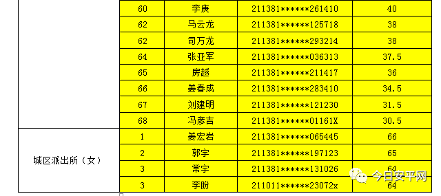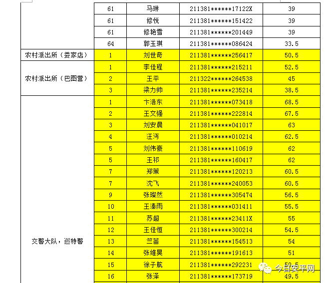 辽宁安平人力资源服务有限公司北票市分公司受北票市公安局的委托,现面向社会招聘工作人员,现将北票市公安局招聘辅警笔试成绩及进入体能测试人员(涂黄人员)名单公告如下: