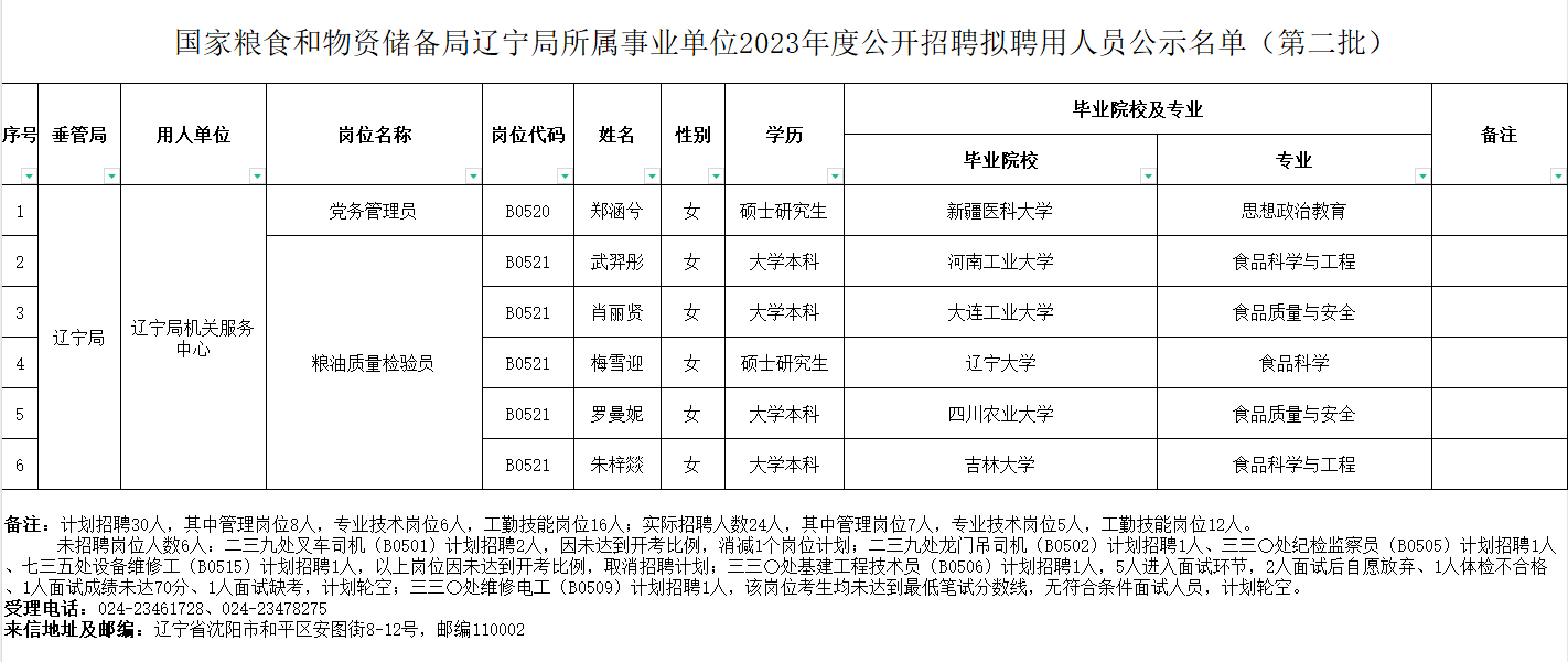 国家粮食和物资储备局辽宁局所属事业单位2023年度公开招聘拟聘用人员公示名单(第二批)