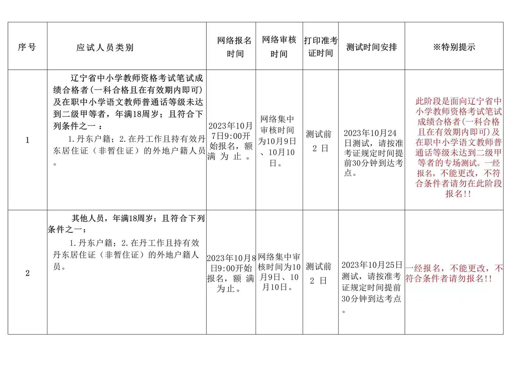 为更好地与教师资格认定工作衔接及解决个别在职中小学语文教师普通话等级未达到二级甲等问题,本次测试将安排部分场次作为面向辽宁省中小学教师资格考试笔试合格(一科合格即可)及在职中小学语文教师普通话等级未达标人员的专场测试;其他场次面向符合条件的社会人员开放。参加测试人员需持有丹东市户籍或居住证(非暂住证),年满18周岁(2005年10月31日前出生)。