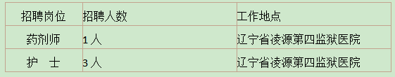 根据监狱工作需要,辽宁省凌源第四监狱现面向社会公开招聘男性药剂师1名,男性护士3名。现将有关事项公告如下: