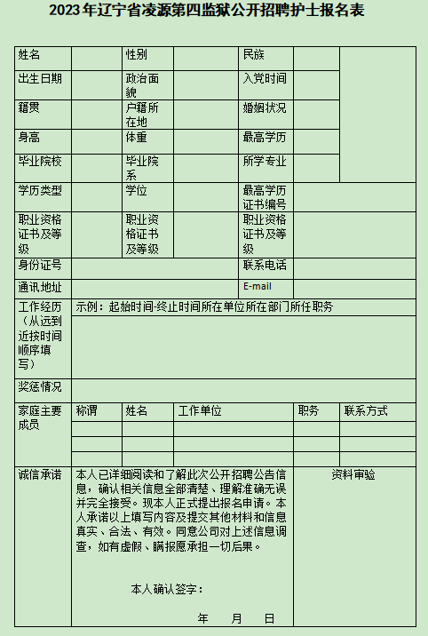 ① 《辽宁省凌源第四监狱2023年公开招聘工作人员报名登记表》1份(此表由应聘者本人手写签字,粘贴照片);