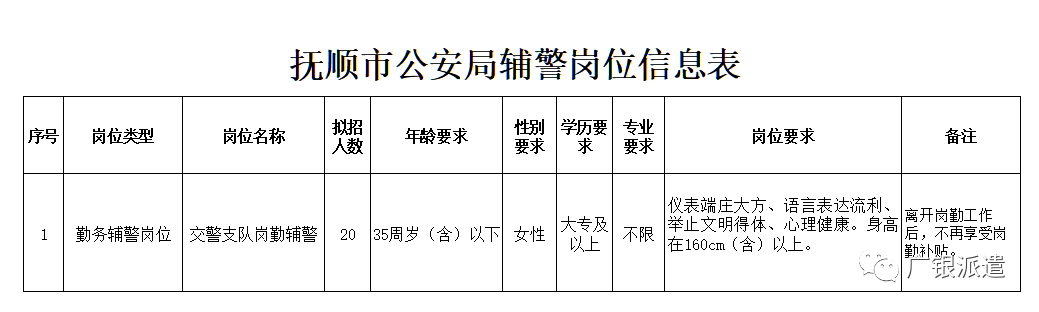 根据工作需要,经有关部门批准,抚顺市公安局拟向社会公开招聘警务辅助人员(以下简称“辅警”)20名,用工形式为劳务派遣制,不具有人民警察身份,具体招聘事宜如下: