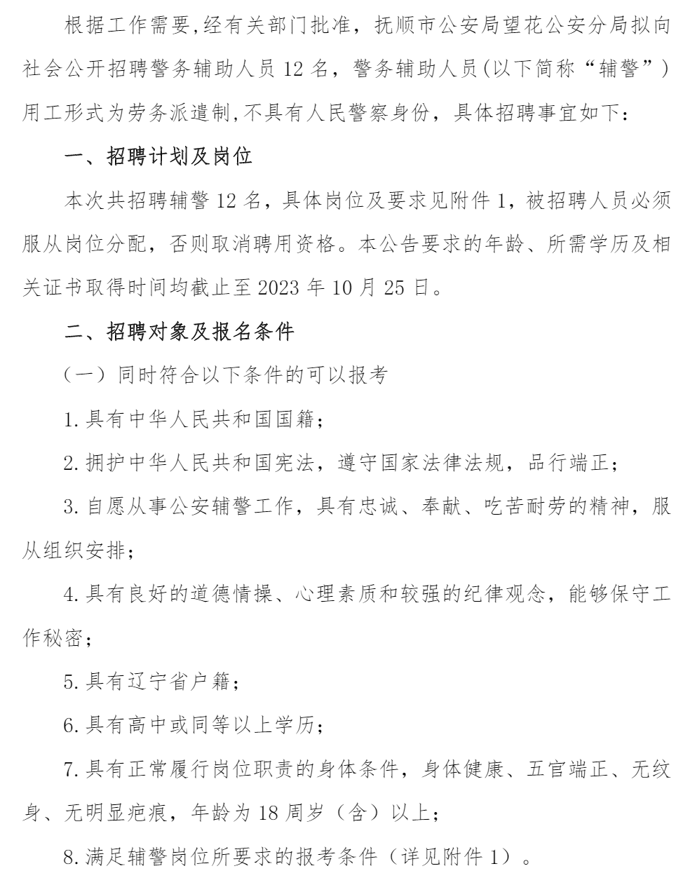 2023年10月抚顺市公安局望花公安分局招聘警务辅助人员12人公告