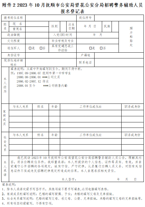 附件:2023年10月抚顺市公安局望花公安分局招聘警务辅助人员报名表