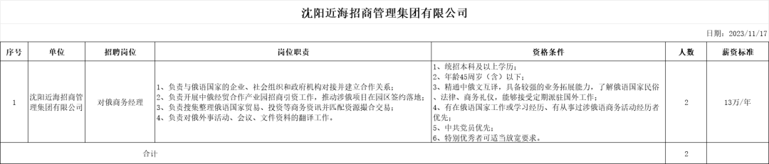 根据沈阳近海招商管理集团有限公司经营发展需要,为全力推进中俄经贸产业园招商工作,加强国有企业人才队伍建设,现面向社会公开招聘优秀人才,具体招聘事宜公告如下: