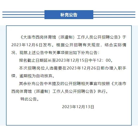 大连市西岗体育馆(派遣制)工作人员公开招聘 补充公告