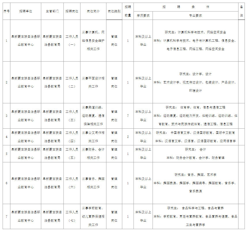 具体单位及岗位资格条件详见《阜新蒙古族自治县招聘特色体育、职业教育等专业人才岗位信息表》。