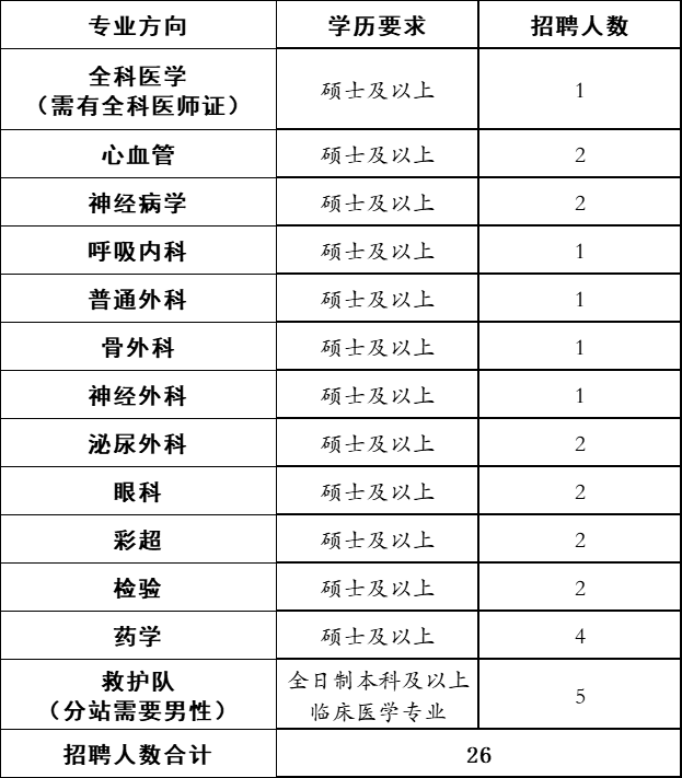 因工作需要,经院党委研究决定,面向社会公开招聘26名合同医生,所需医生专业方向及人数、招聘条件、招聘方式及待遇如下: