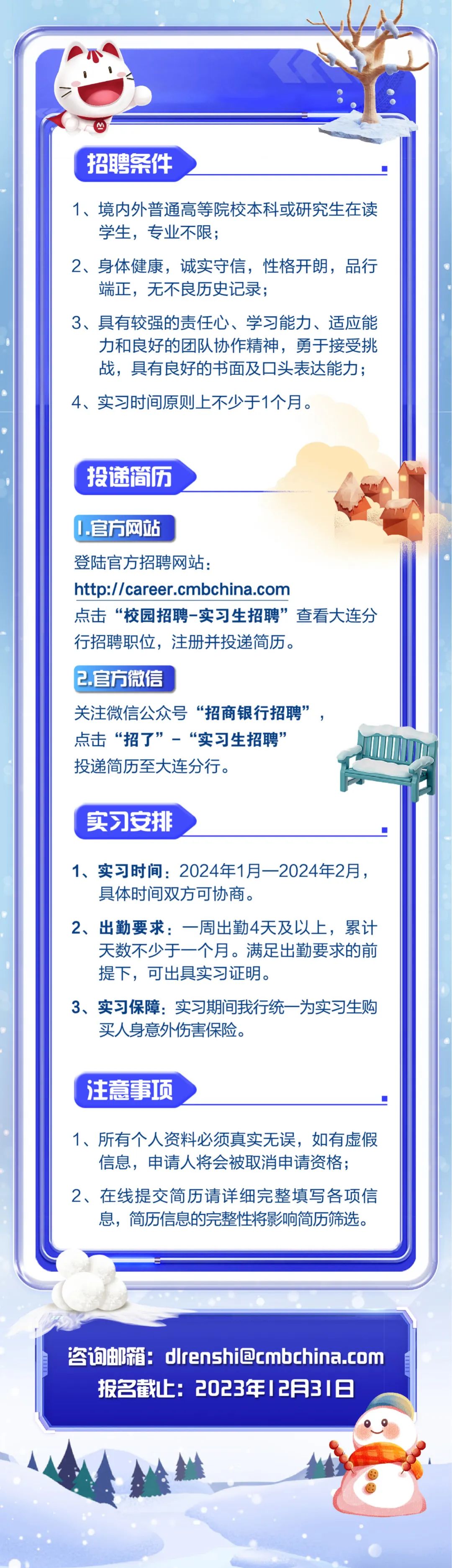 大连|“梦工场”招商银行大连分行2024寒假实习生招聘