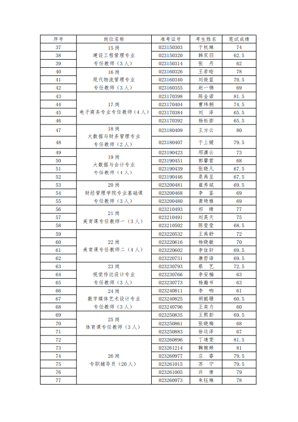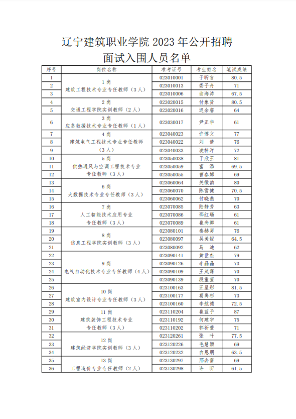 辽宁建筑职业学院2023年公开招聘面试入围人员名单