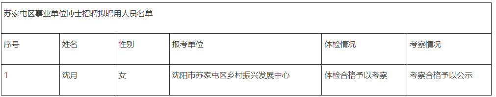 根据《沈阳市事业单位公开招聘博士人才公告》相关规定,现将苏家屯区公开招聘博士拟聘用人员信息公示如下,公示时间为7个工作日。公示期间对拟聘用人员如有疑义请与沈阳市苏家屯区人力资源和社会保障局联系。