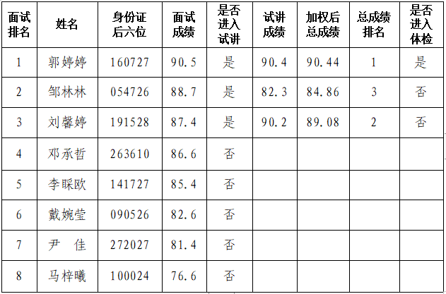 一、面试成绩、试讲成绩、总成绩及拟入围体检人员名单