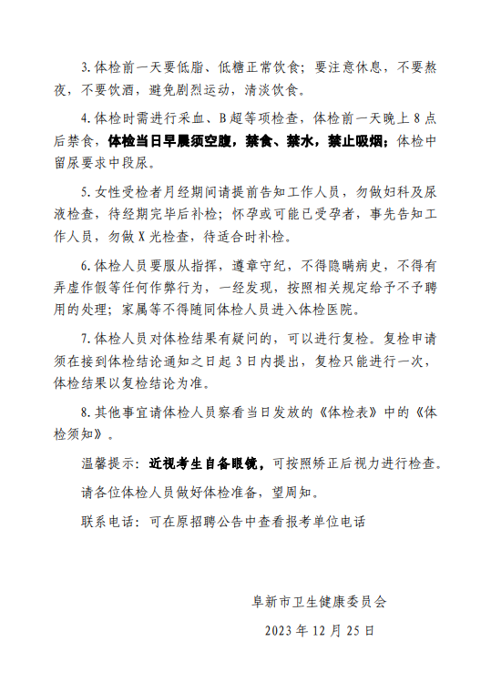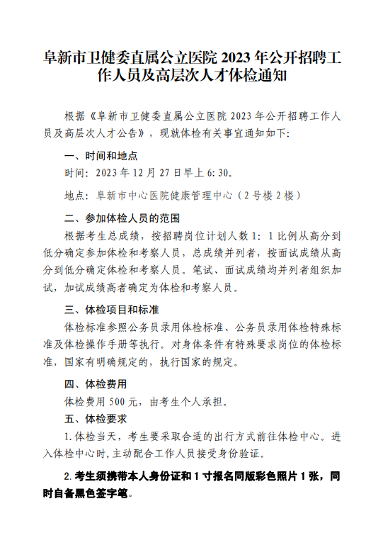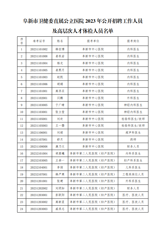 阜新市卫健委直属公立医院2023年公开招聘工作人员及高层次人才体检通知