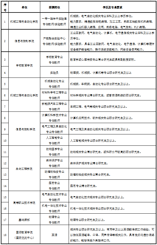 机械工程与自动化学院招聘的教师中俄语熟练者优先,待遇从优。国际教育学院招聘的教师中有海外工作经验或者留学经历者优先,待遇从优。学前教育学院招聘的教师中拥有高级及以上职称者优先,待遇从优。