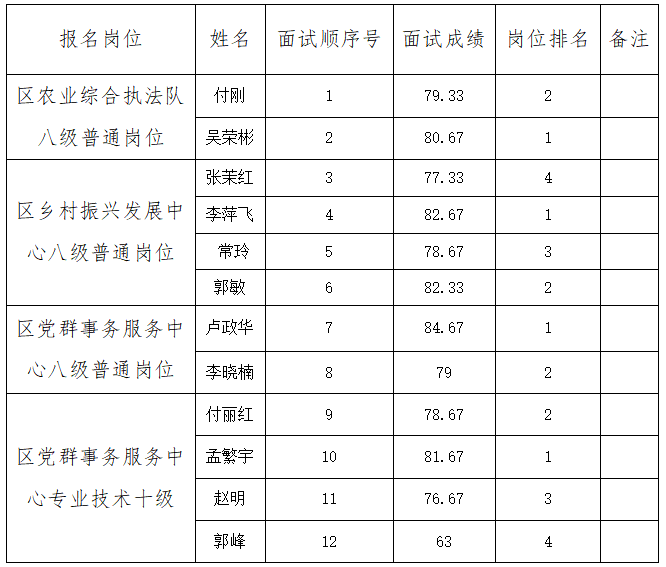 按照区农业综合执法队、乡村振兴发展中心、党群事务服务中心公开遴选全额事业编制工作人员的工作安排,现对面试成绩公布如下: