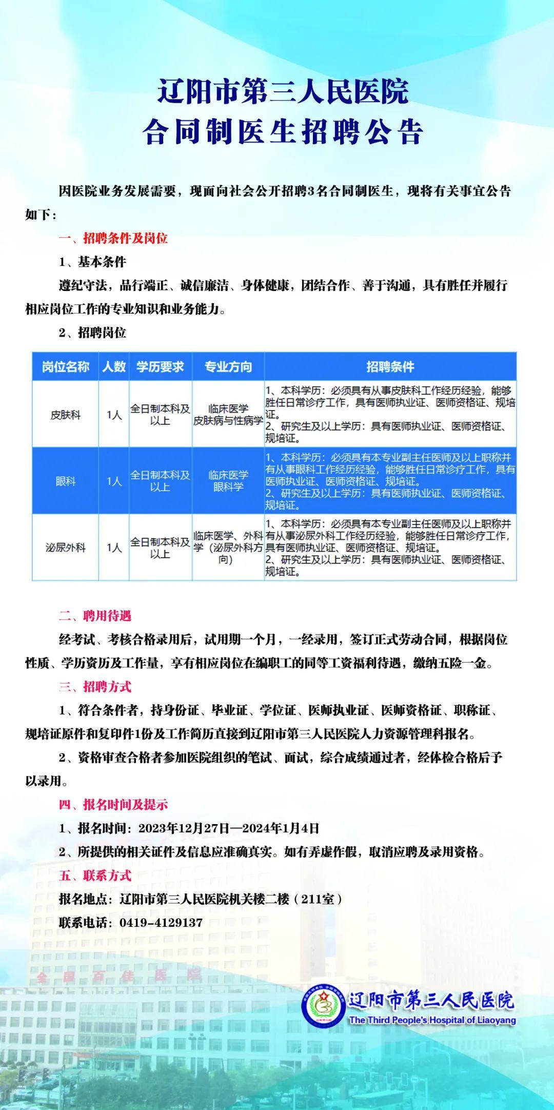 辽阳市第三人民医院合同制医生招聘3人公告
