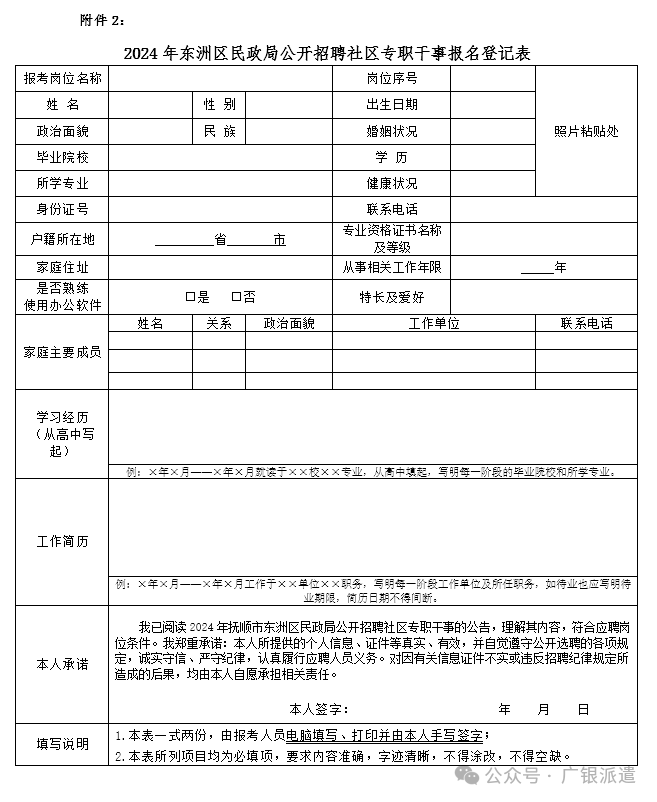(1)《2024年东洲区民政局公开招聘社区专职干事报名登记表》(附件2)一份(所有报名人员需实名加入QQ群263380987,在群文件中下载填写完整并打印,再在签名处手写签名,粘贴好近期彩色一寸照片,不限底色。)