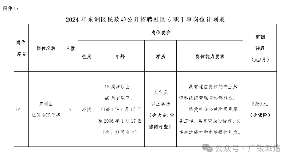 详见《2024年抚顺市东洲区民政局公开招聘社区专职干事岗位计划表》(附件1)。