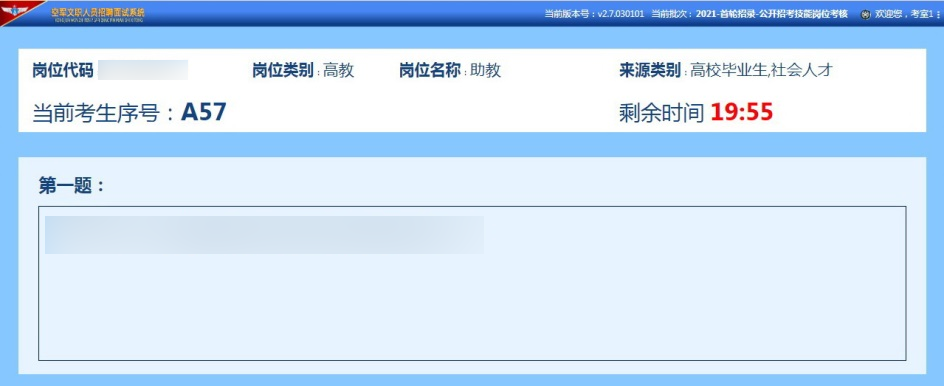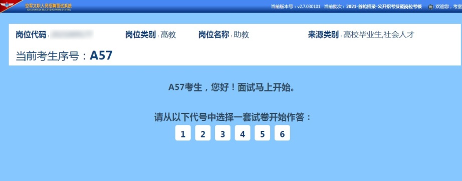 6.面试。按照抽签次序,依次进入考室参加面试。考生入场后,按要求报告,不得公开姓名。报告词为:“考官好,我是A1号报考人员,报考岗位代码XXXX,准备参加考核”。然后按指定位置就坐,聆听主考官介绍情况、提出要求。面试时,通过面试席前的笔记本电脑,随机抽选一套面试题,按照主考官提问进行答题。回答完后请说“回答完毕”。