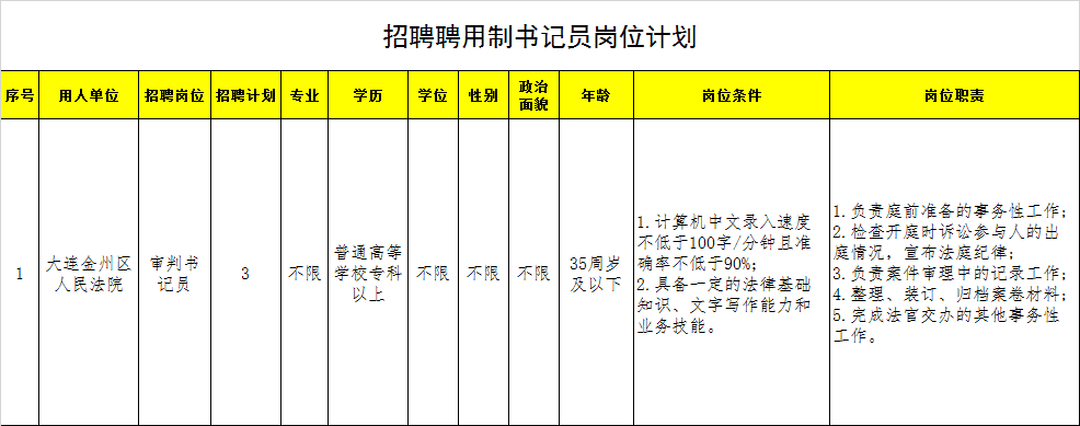 为满足工作需要,现面向社会公开招聘聘用制书记员,派驻至大连市金州区人民法院工作。现将有关事项公告如下: