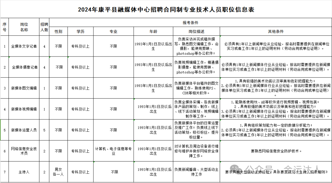 为推进康平县融媒体中心建设快速发展,全面提高新闻舆论宣传能力,解决县融媒体中心专业技术人员短缺问题,经县政府批准,现面向社会公开招聘合同制专业技术人员19人。融媒体中心负责本次招聘,沈阳金运达人人力资源有限公司配合开展此项工作,公众号“金运达人”为官方信息发布平台。具体事宜如下: