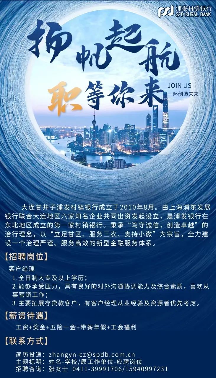 大连甘井子浦发村镇银行招聘