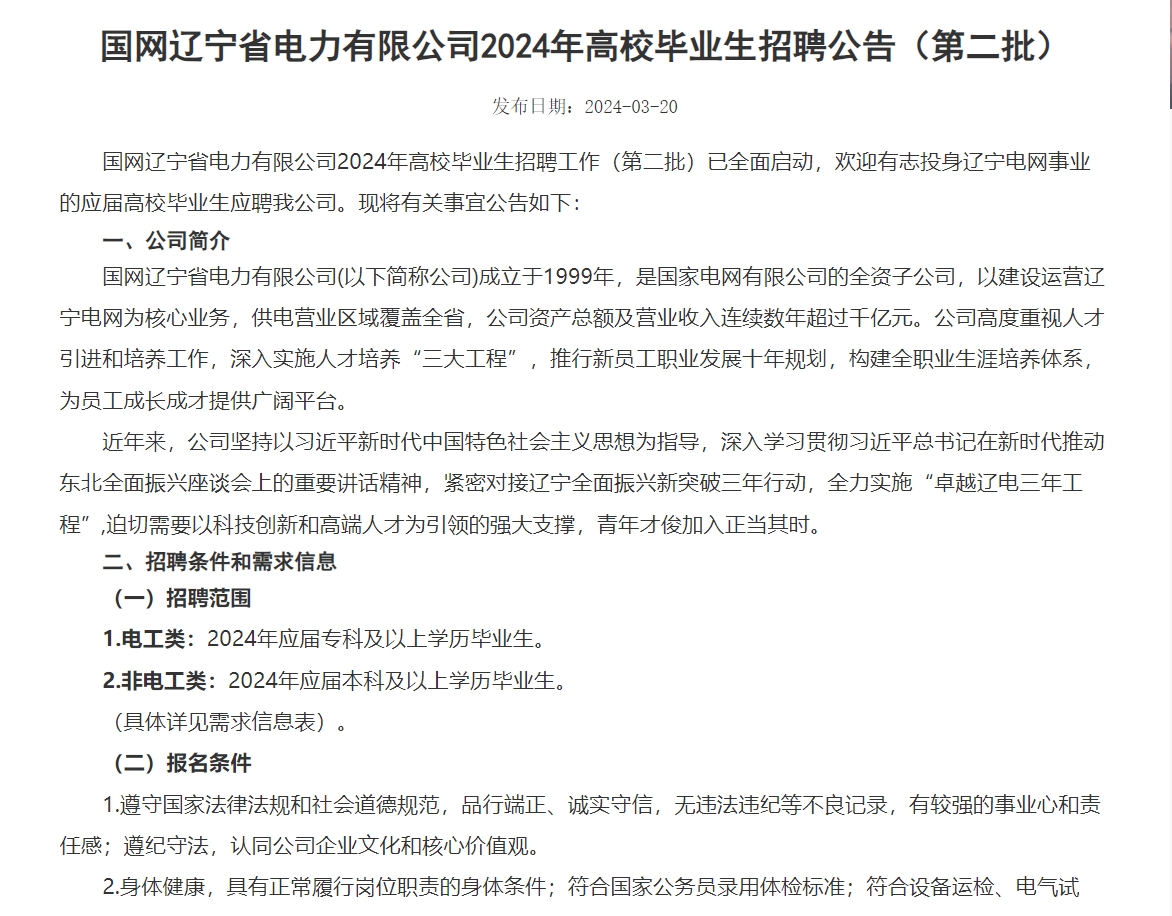 国网辽宁省电力有限公司2024年高校毕业生招聘165人公告(第二批)