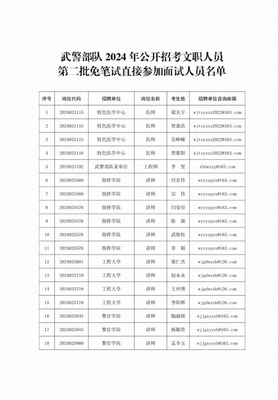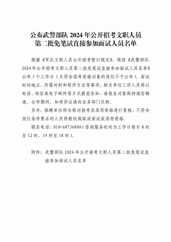 公布武警部队2024年公开招考文职人员第二批免笔试直接参加面试人员名单