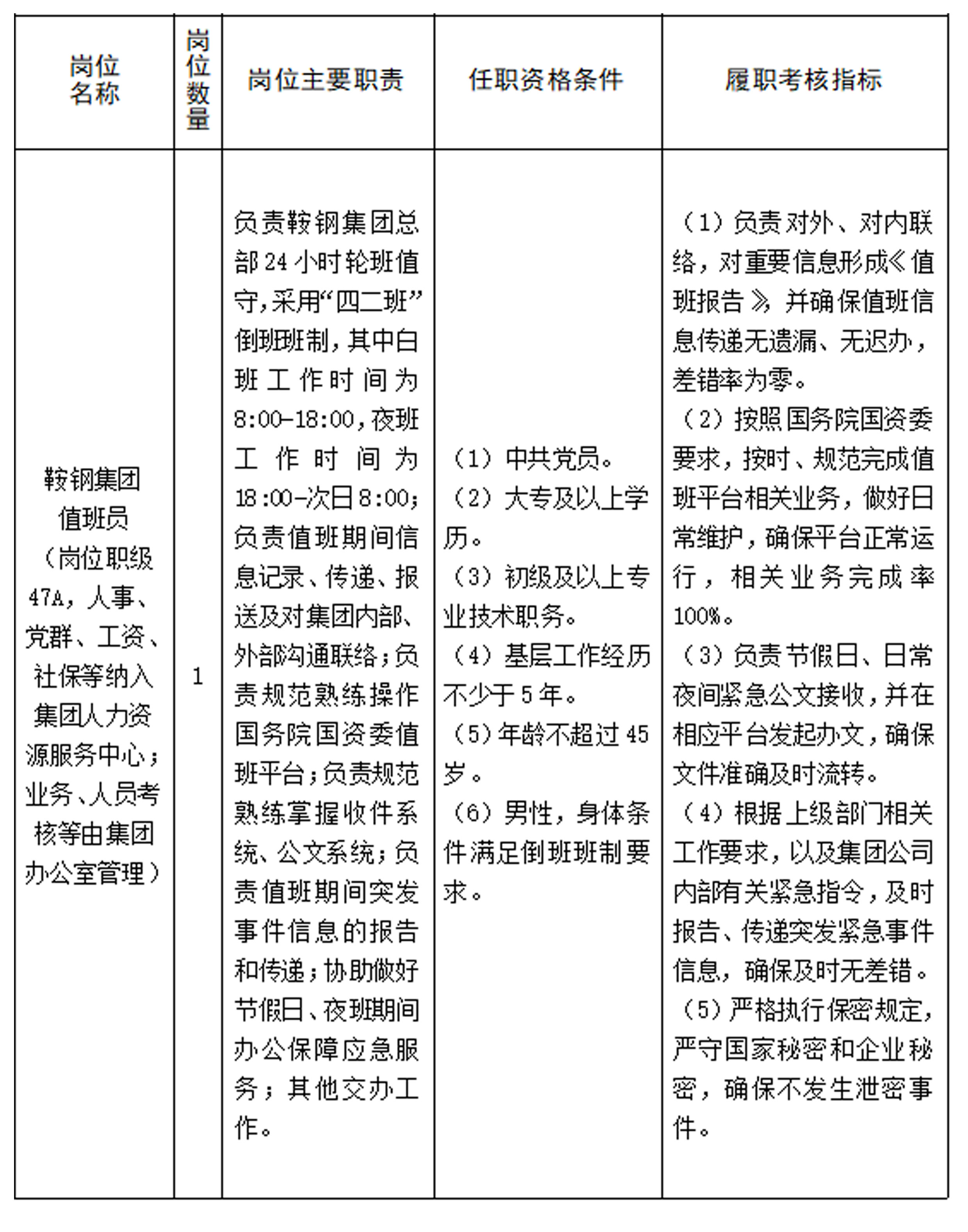 按照鞍钢集团三项制度改革相关要求,为进一步扩大选人用人视野,鞍钢集团党委组织部决定在全集团范围内公开选拔1名值班员,欢迎符合条件的人员和广大职工积极参与和监督。具体要求如下: