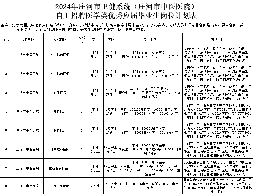 本次共招聘事业编制医学类优秀应届毕业生66名,具体岗位信息详见《2024年庄河市卫健系统自主招聘事业编制医学类优秀应届毕业生岗位计划表》(附件1)。