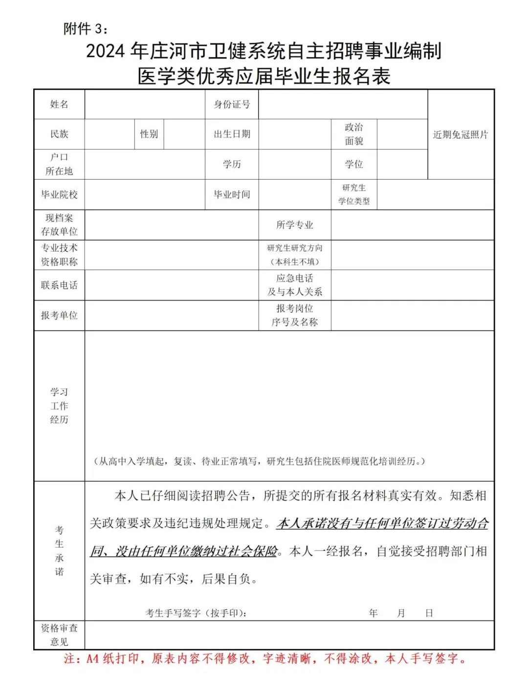 ①《2024年庄河市校园自主招聘事业编制医学类优秀应届毕业生报名表》(附件3);