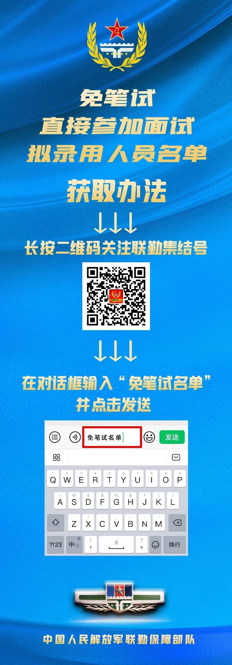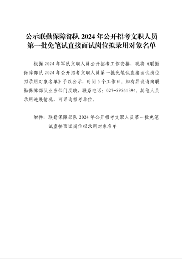 根据2024年军队文职人员公开招考工作安排,现将《联勤保障部队2024年公开招考文职人员第一批免笔试直接面试岗位拟录用对象名单》予以公示,时间5个工作日。