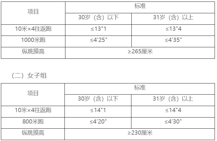 除10米×4往返跑项目测评次数不超过2次,纵跳摸高测评次数不超过3次外,其他项目只允许考生进行1次测评。考生取得有效成绩后,不允许进行补测。凡应测项目中任意一项不达标的,即为体能测评不合格。