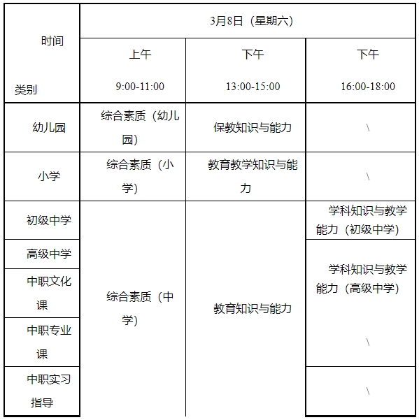 (三)全国统一考试时间为3月8日,各类别考试科目与时间安排如下: