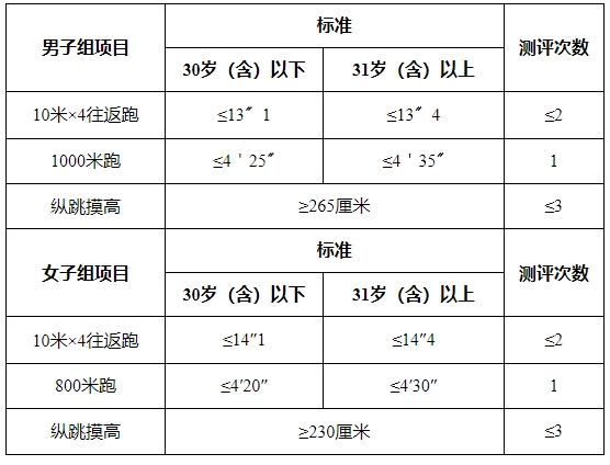 需要说明的是:年龄计算时间截止到参加体能测评当月,即1994年4月(含)以后出生的考生体能测评标准,按照30岁(含)以下的标准执行;1994年3月(含)以前出生的考生体能测评标准按照31岁(含)以上的标准执行。