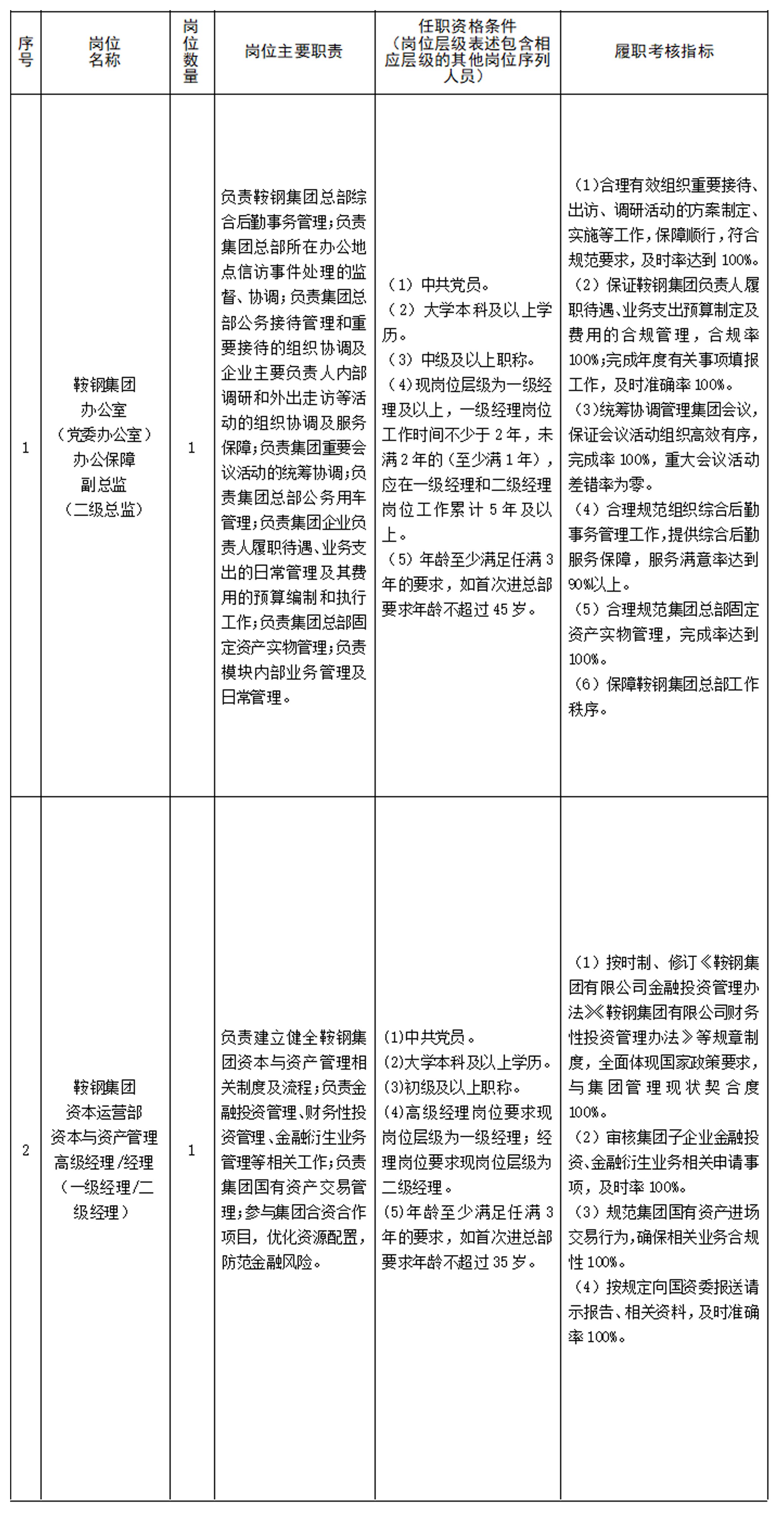 按照鞍钢集团三项制度改革相关要求,为进一步扩大选人用人视野,鞍钢集团党委组织部决定在全集团范围内公开选拔2名专业职能岗位人员,欢迎符合条件的人员和广大职工积极参与和监督。具体要求如下: