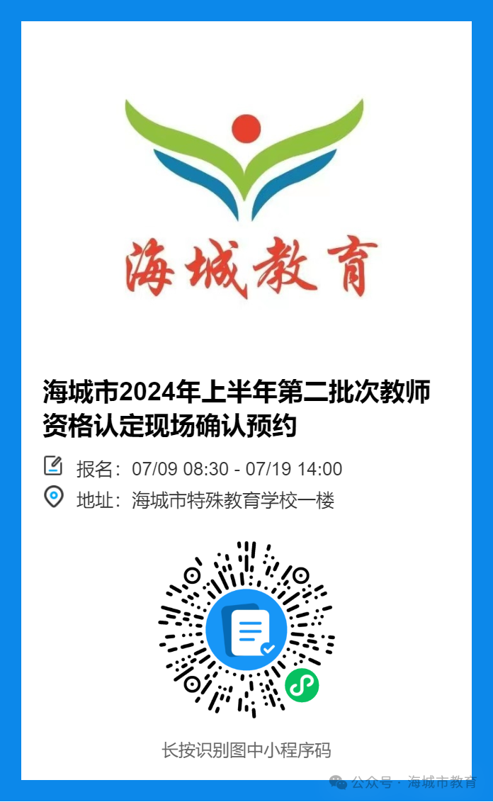 海城市教育局定于7月15日—19日期间开展2024年上半年(第二批)幼儿园、小学、初级中学教师资格认定现场确认工作,请本批次报名参加幼儿园、小学、初级中学教师资格认定的考生按照要求准备好相关材料,进行现场确认预约,并在预约时段内到指定地点参加现场确认。