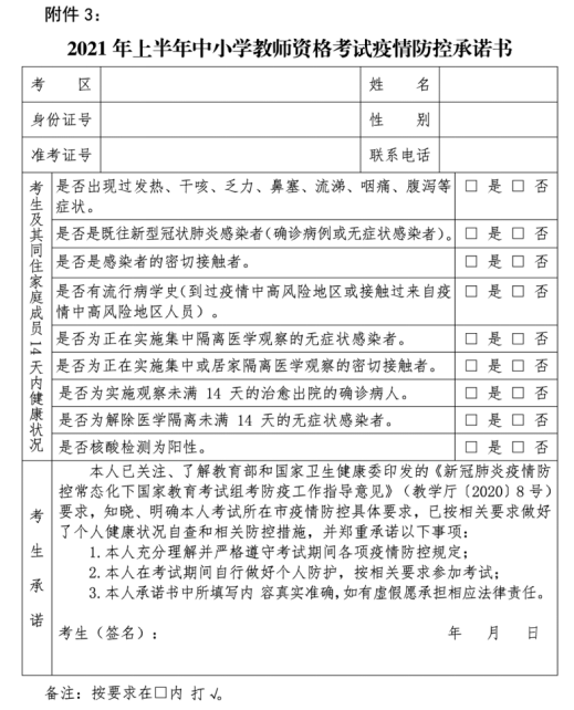 (五)考生须提前关注、了解教育部和国家卫生健康委印发的《新冠肺炎疫情防控常态化下国家教育考试组考防疫工作指导意见》(教学厅〔 2020 〕8 号 )要求,及时关注本人考试所在市疫情防控具体要求,按相关要求做好个人健康状况自查,落实好相关防控措施,参加考试时要服从工作人员的疫情检查和管理。考生须自行下载打印《 2021年上半年中小学教师资格考试疫情防控承诺书》(见附件3 ), 并按要求如实填写有关内容,对于刻意隐瞒病情或者不如实报告发热史、旅行史和接触史的,以及在考试期间不服从考点防疫工作安排的,将按照《中华人民共和国传染病防治法》、《关于依法惩治妨害新型冠状病毒肺炎疫情防控违法犯罪的意见》等法律法规予以处理。考生在当天每科考试入场时将填写完整的《 2021年上半年中小学教师资格考试疫情防控承诺书》交给工作人员,同时出示辽事通和国务院行程码方可入场参加考试。