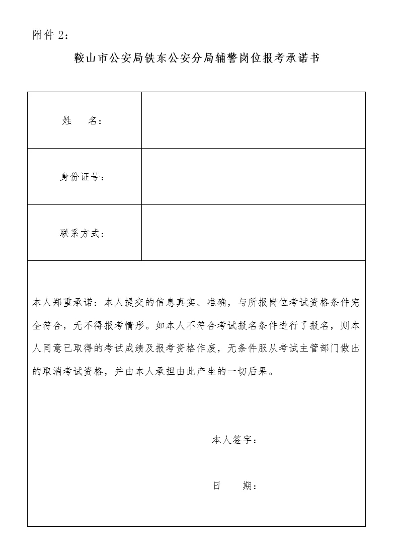 (6)鞍山市公安局铁东公安分局辅警岗位报考承诺书(附件2)