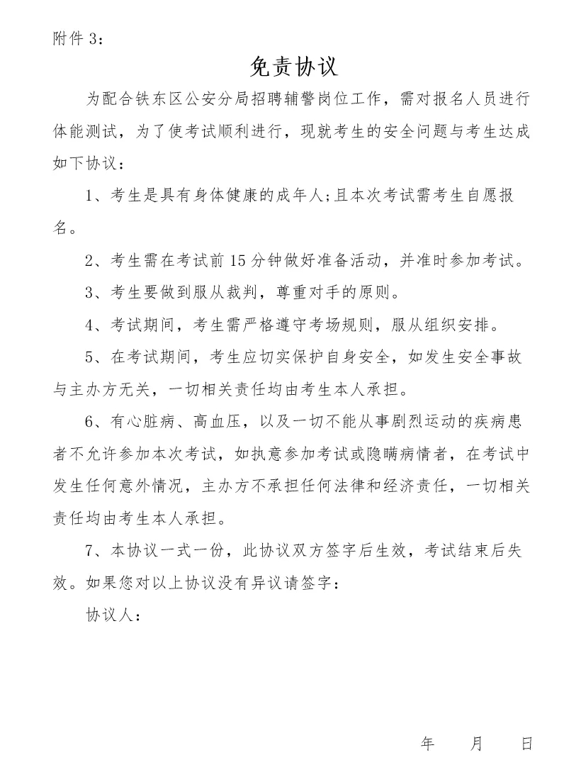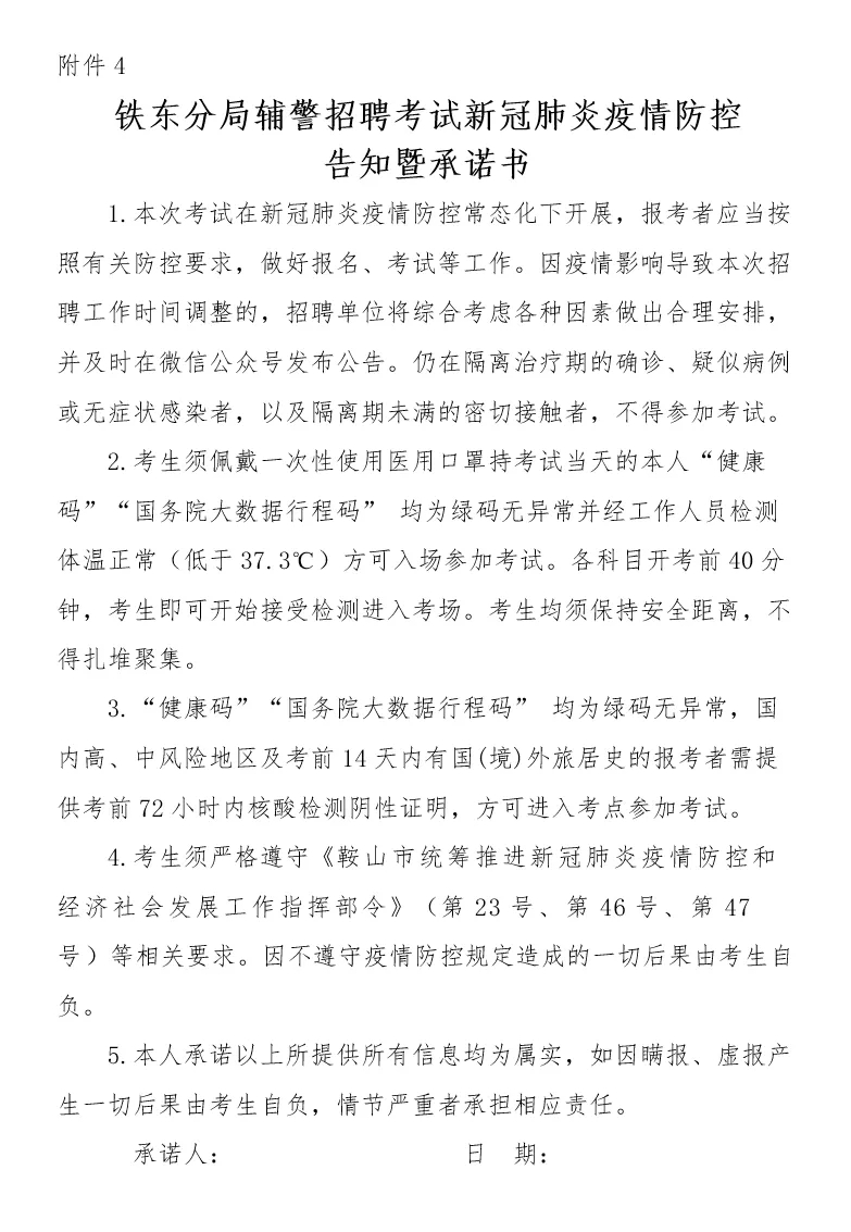 附件4.铁东分局辅警招聘考试新冠肺炎疫情防控告知暨承诺书。