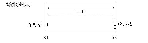 受测试人员采用站立式起跑,听到发令后从S1线外跑到S2线前(脚不得踩线)用手将竖立的木块推倒后折返,往返跑2次,每次推倒1个木块,第2次返回时冲出S1线。按组别进行测试,每人最多可测2次,1次测试达标,即视为该项目测试合格。
